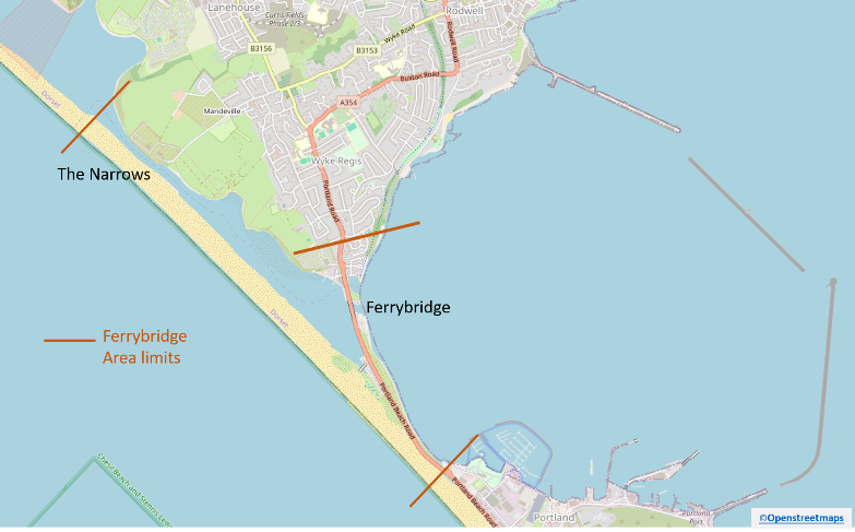 The area described in these pages is defined in the map above and stretches from the Narrows in the north down to the Chiswell drainage channel and includes the southernmost area of Wyke Regis.