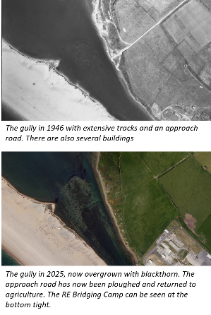 As well as the car park area a large number of vehicles were stored in the fields around the Bridging Camp at The Narrows. A gully was dug out of the shoreline bank so that amphibious vehicles could practice entering and exiting the water of the Fleet. Although overgrown, this gully is still visible today.