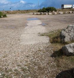 Note that the route of the pipeline is under the low grassy bank. The line of holes in the vegetation is believed to be where the pebbles were scooped up to cover the pipe. There are two exposed sections of pipe at the northern end of the grassy area by the remains of a pillbox. At the southern end there are a number of control valves set in rough concrete bases.