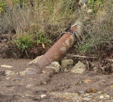 The landshore bank has eroded over the 80 years and exposed the pipe as it leaves the bank and enters the mud.