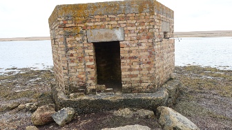 Old pillbox on the mud below the caravan park at Ferrybridge in 2024.