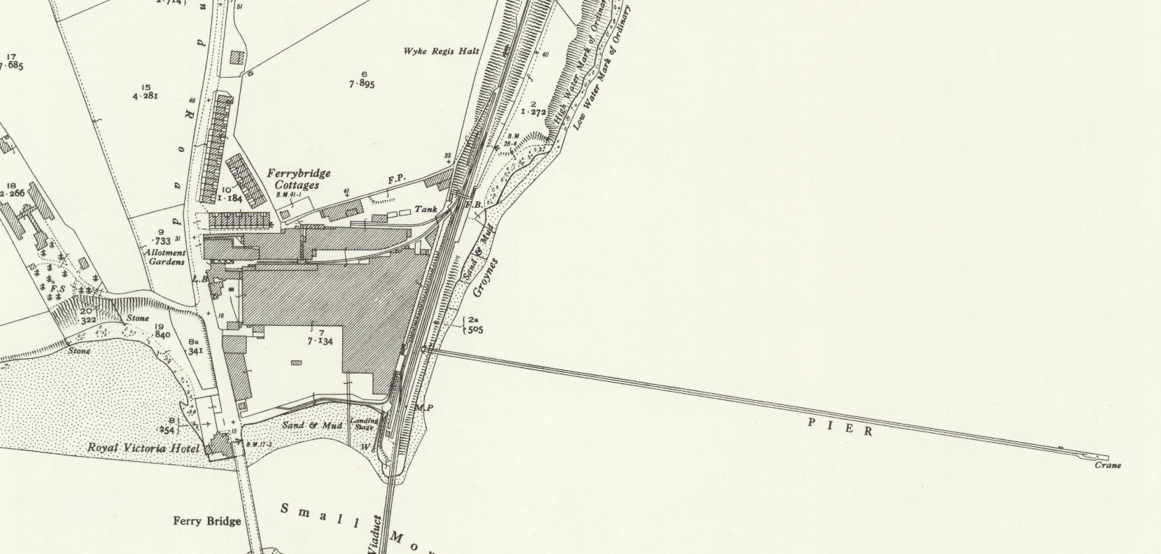 As the line approached Ferrybridge it passed Wyke Regis halt followed by a series of sidings serving the Whitehead torpedo works. The line then crossed the bridge over the entrance to the Fleet before running the length of Hamm Beach towards Portland.