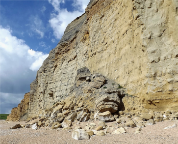 At the northern end of Chesil Beach the cliffs are a distinctive yellow colour arising from the Bridport Sandstone. It has a characteristic banded appearance with different bands weathering at different rates, which often results in undercutting of the cliffs. This causes the frequent rock falls in this area. Picture 1 shows the cliff at Burton Hive Beach and illustrates the undercutting that can occur. The sandstone is capped with inferior oolite between Burton Hive and Freshwater and this in turn is capped with Frome clay.