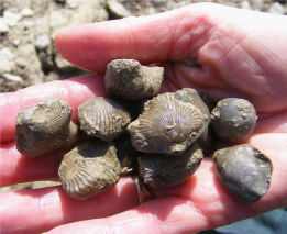 At Langton Hive Point an oyster bed (lumachelle) is exposed within the Frome Clay, formerly known as Fullers Earth Clay (see Picture 4). The main fossil found is the oyster Ostrea hebridica (see Picture 5). Further south on the north side of Herbury Gore another fossil bed is exposed, the boueti bed, with many brachiopods, Rhynchonella boueti (Picture 6).